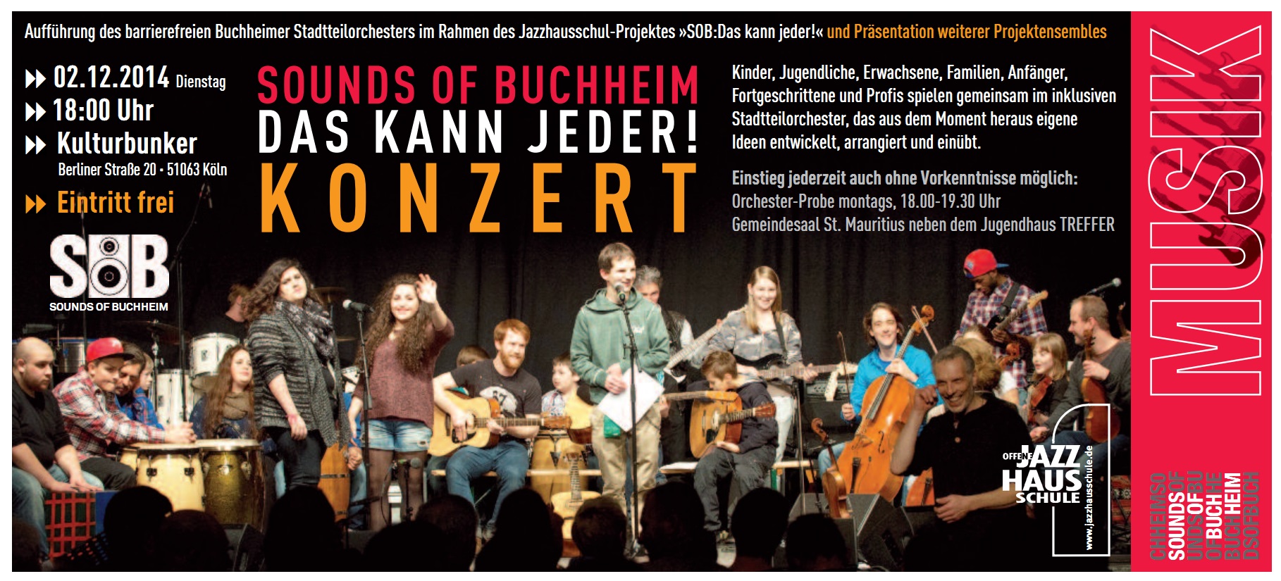 Das inklusive Stadtteilorchester, bestehend aus bis zu 30 Mitwirkenden, bildet seit 2013 den Dreh- und Angelpunkt des seit 2008 bestehenden Netzwerkprojekts ‚Sounds of Buchheim‘ (SOB). Dabei kommen Menschen jeden Alters mit unterschiedlichen kulturellen, sozialen und Bildungshintergründen mit und ohne musikalische Vorkenntnisse zusammen, um unter professioneller Anleitung gemeinsam Musik zu machen.